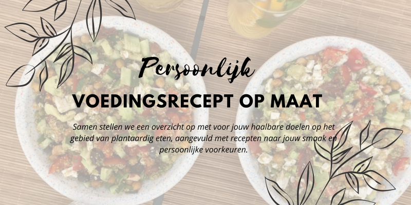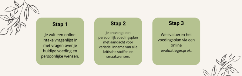 Je vult een online vragenlijst in en op basis van jouw antwoorden ga ik aan de slag met een persoonlijk voedingsplan. Ik geef je praktische tips en deel makkelijke recepten en/of handige websites om het leuker, lekkerder en makkelijker te maken!