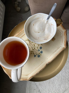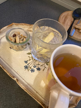 Vanochtend startte ik de dag met een kop kruidenthee, een glas lauwwarm water met gember en een klein bakje ongezouten notenmix.